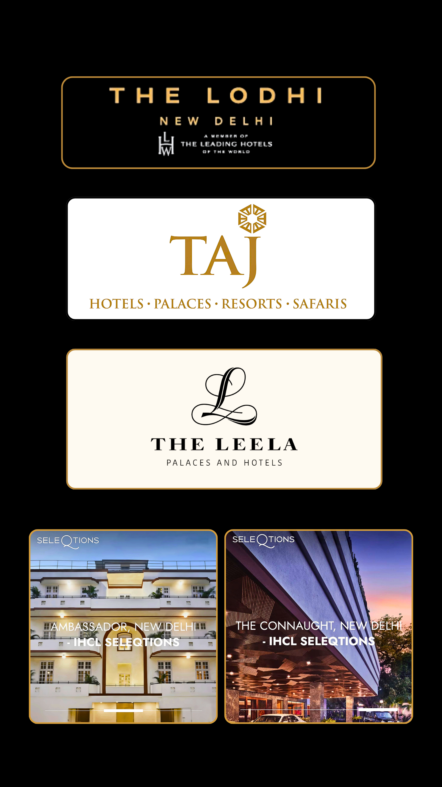 From the iconic Taj Hotel Group and the historic The Leela Palace to the elegant Lodi, the classic Ambassador Hotel, and the distinguished Connaught, our hampers are crafted to impress, delight, and leave a lasting impression.